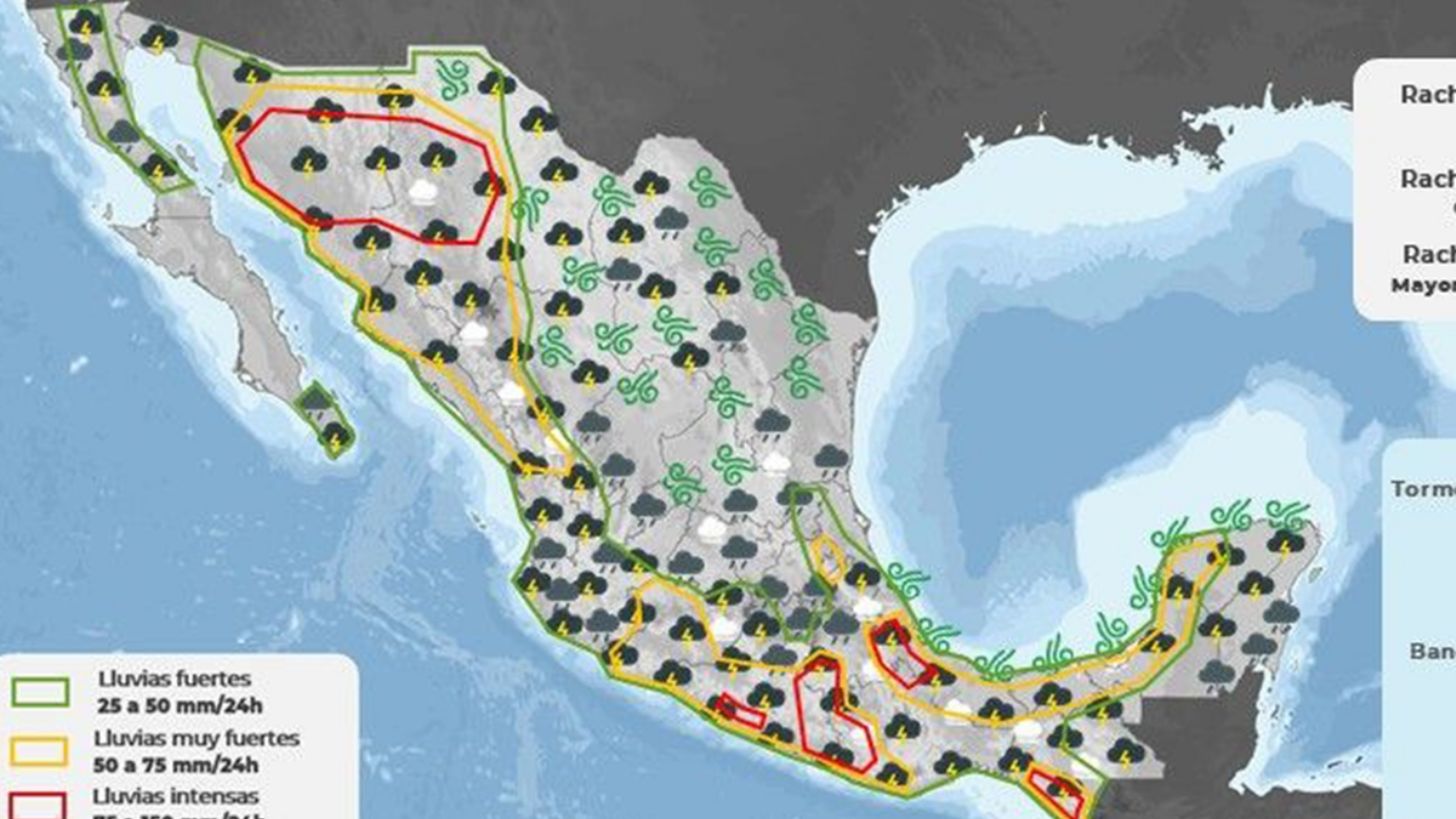 Por otra parte el monzón mexicano sobre el noroeste de la República Mexicana, en interacción con un centro de baja presión que se ubicará sobre el occidente de Sonora, donde se darán precipitaciones puntuales con posibles granizadas en Chihuahua y Sonora.