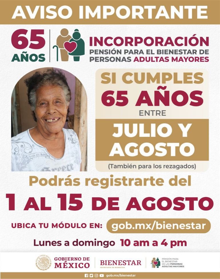 De tal modo y si ya tienes los 65 años cumplidos y naciste entre julio y agosto, ya puedes inscribirte a la Pensión del Bienestar, de acuerdo con las siguientes fechas de registro, establecidas conforme a la primera letra de tu apellido paterno.