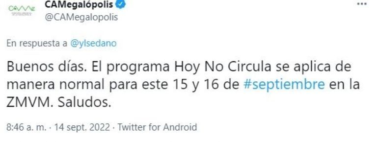 Según dio a conocer la Comisión Ambiental de la Megalópolis (CAME) en sus redes sociales, se mantendrá el Hoy No Circula los días 15 y 16 de septiembre en la CDMX y EDOMEX, por lo que se mantiene el orden de descanso para los automóviles dependiendo el engomado y la numeración.