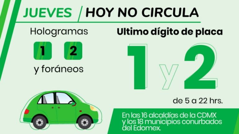 - Vehículos con holograma uno, engomado verde, terminación de placa: 1 y 2.