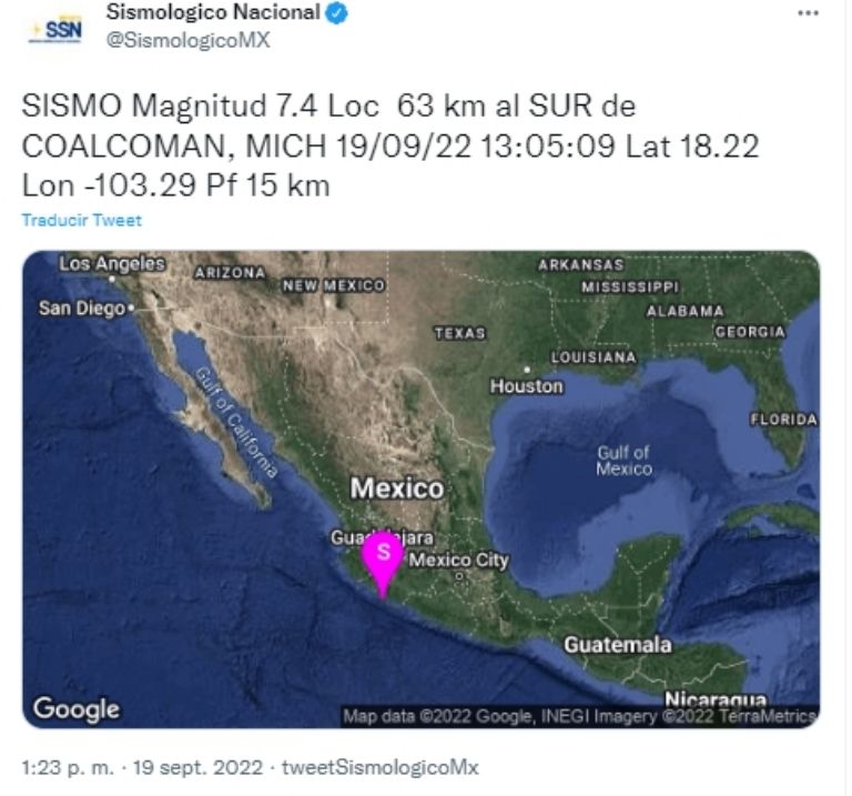 Un sismo de 6.8 grados, escala Richter (preliminar) se dejó sentir en México este 19 de septiembre de 2022, según reportó el Servicio Sismológico Nacional. El epicentro fue en el estado de Michoacán, a 63 kilómetros del municipio de Coalcoman. Sin embargo, minutos después, el mismo SSN ajustó la magnitud e informó que fue de 7.4 grados en la mencionada escala.