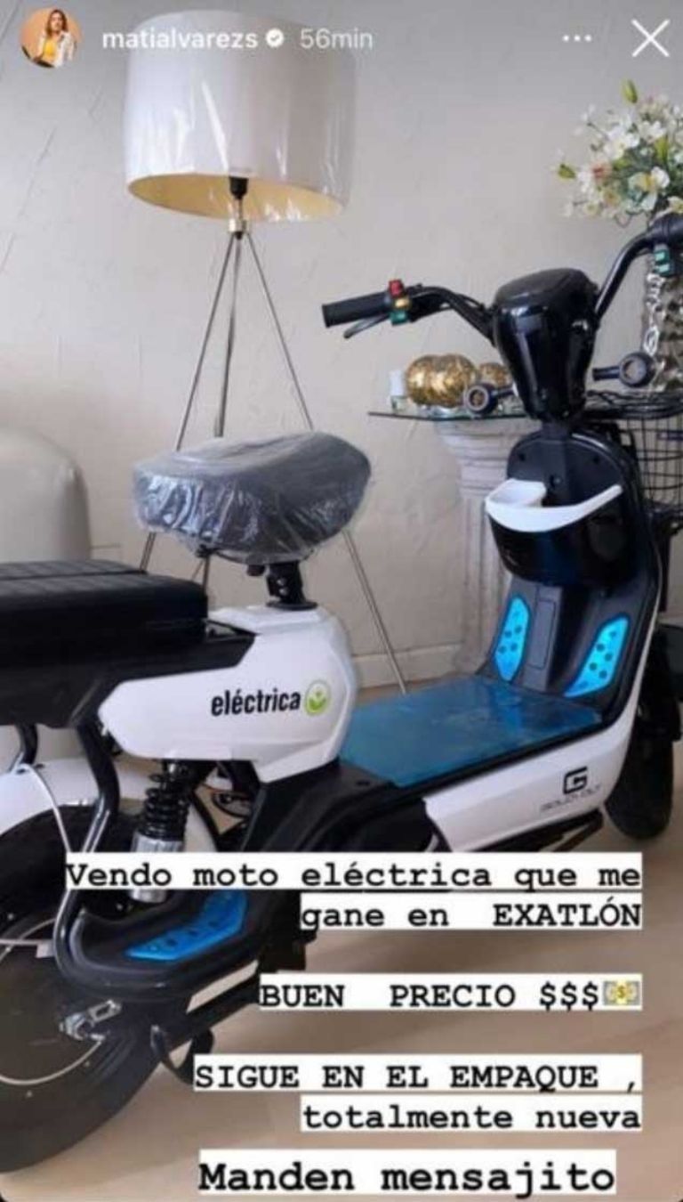 Uno de estos premios fue el que puso a la venta: una moto eléctrica de color blanco que se ganó en una de las temporadas del Exatlón México, ya que aparentemente no la usaba, pues en el anuncio puso que tenía algunos plásticos que demostraban que estaba nueva y nunca se había usado. “Vendo moto eléctrica que me gané en Exatlón, buen precio, sigue en el empaque, totalmente nuevo”, fue el mensaje que publicó en sus redes sociales.