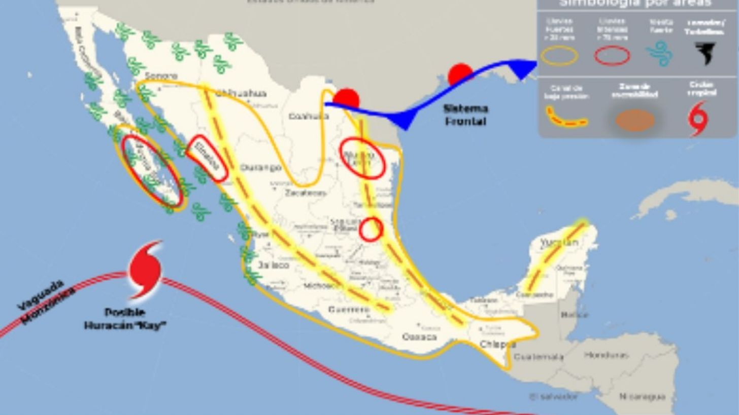 El Servicio Meteorológico Nacional informó que la Tormenta Tropical Kay primero iniciará como depresión tropical viajando al sureste de Guerrero y Michoacán, lo cual hará que las lluvias fuertes y muy fuertes se hagan presentes en entidades del sur del territorio nacional junto a chubascos en estados tales como Jalisco, Colima, Nayarit y Guerrero.