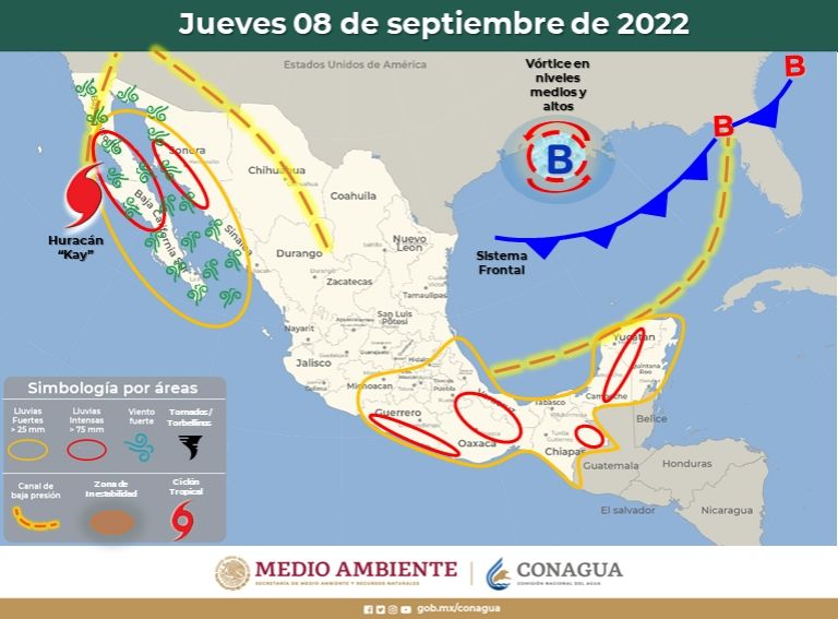 Habrá lluvias fuertes con puntuales muy fuertes (50 a 75 mm) en zonas de Michoacán, Morelos, Tabasco y Quintana Roo, además de intervalos de chubascos con lluvias puntuales fuertes (25 a 50 mm) sobre el norte de Sinaloa tras el paso del Huracá Kay, así como en el Estado de México, Ciudad de México, Tlaxcala e Hidalgo.
