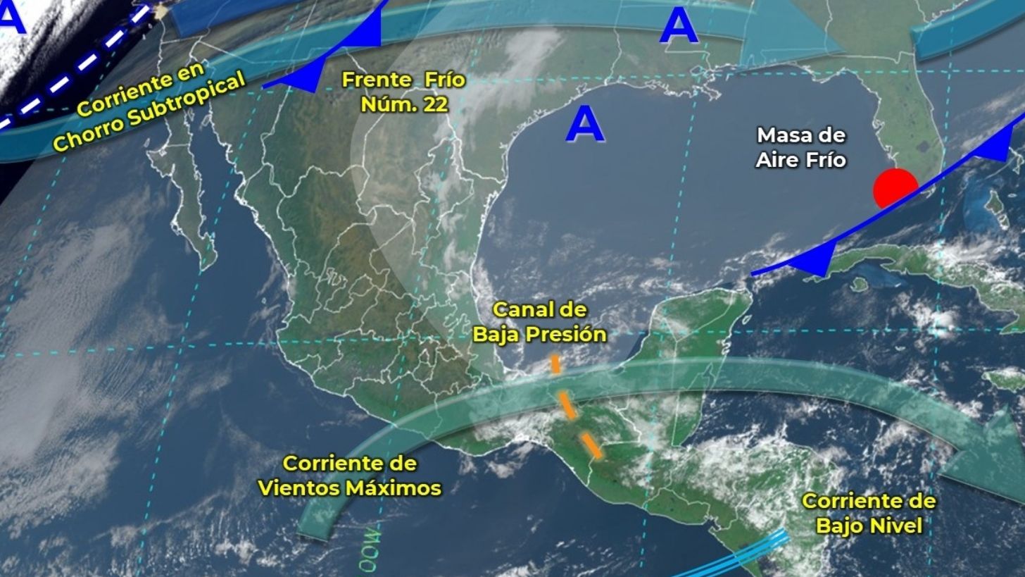 El Servicio Meteorológico Nacional informó que este viernes, debido a una vaguada polar y chorro polar, el frente frío 22 se desplazó lentamente sobre el norte del país con vientos fuertes de hasta 60 kilómetros por hora, mientras el sistema frontal 21 se extendió sobre la Península de Yucatán provocando chubascos, lluvias fuertes y descargas eléctricas, con su masa de aire frío sobre el noreste y oriente del territorio nacional y ambiente frío a muy frío, con heladas.