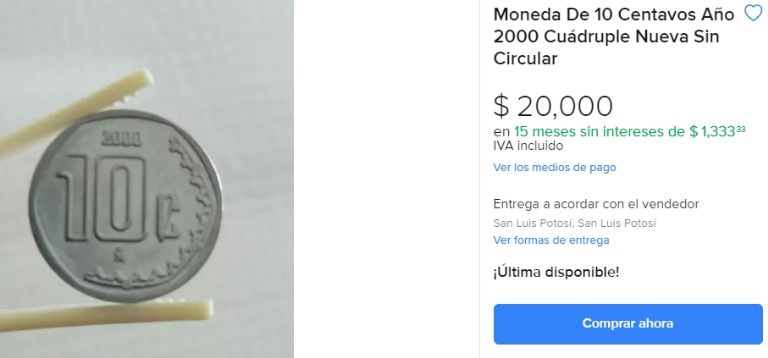 El dueño menciona que radica en el estado de San Luis y, para comodidad de los interesados, ofrece la posibilidad de pagar 15 mensualidades de mil 333 pesos para adjudicarse la moneda de 10 centavos. De cualquier modo, lo más recomendable en este tipo de casos es asistir con un experto en la numismática para que sea él quien te brinde más detalles precisos al respecto.
