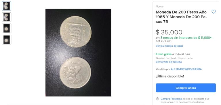 2 monedas de 200 pesos están siendo ofrecidas en Mercado Libre, sitio donde los coleccionistas acuden para revisar materiales con potencial de ser resguardados entre sus vitrinas. Dado que piden 35 mil pesos por ambas, sus características y época tendrían que justificar su precio. ¿Lo crees?