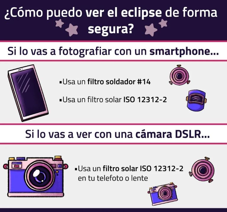 Para fotografiar el eclipse solar reduciendo los riesgos, cualquier imagen debe pasar por un filtro especial para rayos UV o utilizar barreras externas que se coloquen sobre la cámara, como los cristales que se utilizan en las caretas de soldar o gafas especiales para eclipses, siempre y cuando tengan la certificación ISO 12312-2. Ah, pero cuidado pues no se recomienda el uso de láminas oscuras como películas fotográficas, radiografías, vidrios polarizados o acetatos, pues no son suficientes. Mejor, chécate estos consejos técnicos para hacerlo de manera segura.
