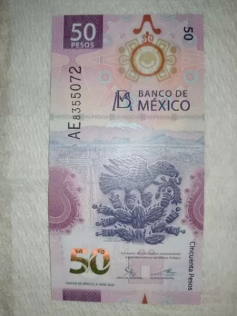 Este billete de 50 pesos guarda relación con la fundación de la Ciudad de México Tenochtitlán, asociada a la guerra sagrada. Otro punto a destacar es el Ajolote Mexicano que aparece en la impresión y el hecho de que el mismo fue impreso por el Banco de México el pasado 31 de marzo del 2021, lo cual lo hace uno relativamente nuevo.