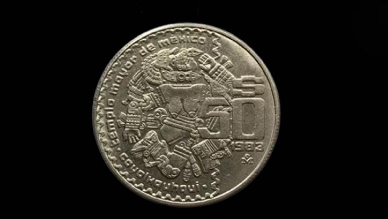 Para poder reconocer la moneda de 50 pesos por la que piden 52 mil pesos, debes observar si tiene en su parte frontal el Escudo Nacional en relieve escultórico con la Leyenda Estados Unidos Mexicanos en Semicírculo en la parte superior. Y esta tiene como pie de título en la descripción “Monedas de Coyolxauhqui”.
