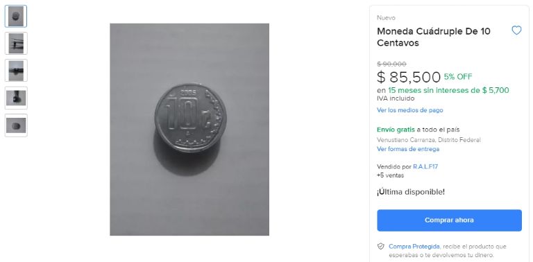 Antes de que la pusieran en oferta por casi 85 mil pesos (en específico, por 85 mil 500 pesos), esta moneda de 10 centavos no bajaba de una cifra concreta: 90 mil pesos. Usuarios de Mercado Libre han cuestionado su legitimidad: señalaron que parece modificada; su dueño advirtió que, pese a que no cuenta con un certificado, se trata de un error humano en su fabricación.