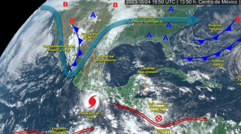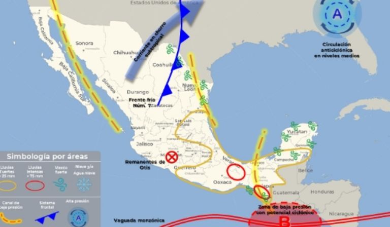 Finalmente, una línea seca que se establecerá en la frontera norte de la República, y que se asociará con un canal de baja presión sobre la Mesa del Norte y una corriente en chorro subtropical, traerán consigo un periodo de lluvias fuertes y chubascos, así como fuertes rachas de viento y posibles tolvaneras en algunos estados específicos del país este jueves 26 de octubre.