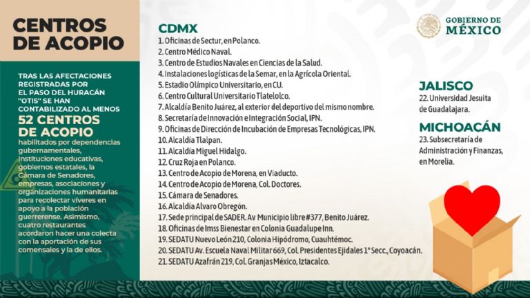 Sin importar la cantidad que puedas aportar, lo que más se requiere para su transportación a las zonas más dañadas por el huracán Otis son atún o sardina en lata, legumbres enlatadas, galletas, barras energéticas, leche en polvo, muchas botellas de agua, café soluble y sopas instantáneas, sin dejar de lado otros artículos de primera necesidad como productos de limpieza, toallas femeninas, alcohol, gel antibacterial, gasas, pañales y hasta vendas y curitas.