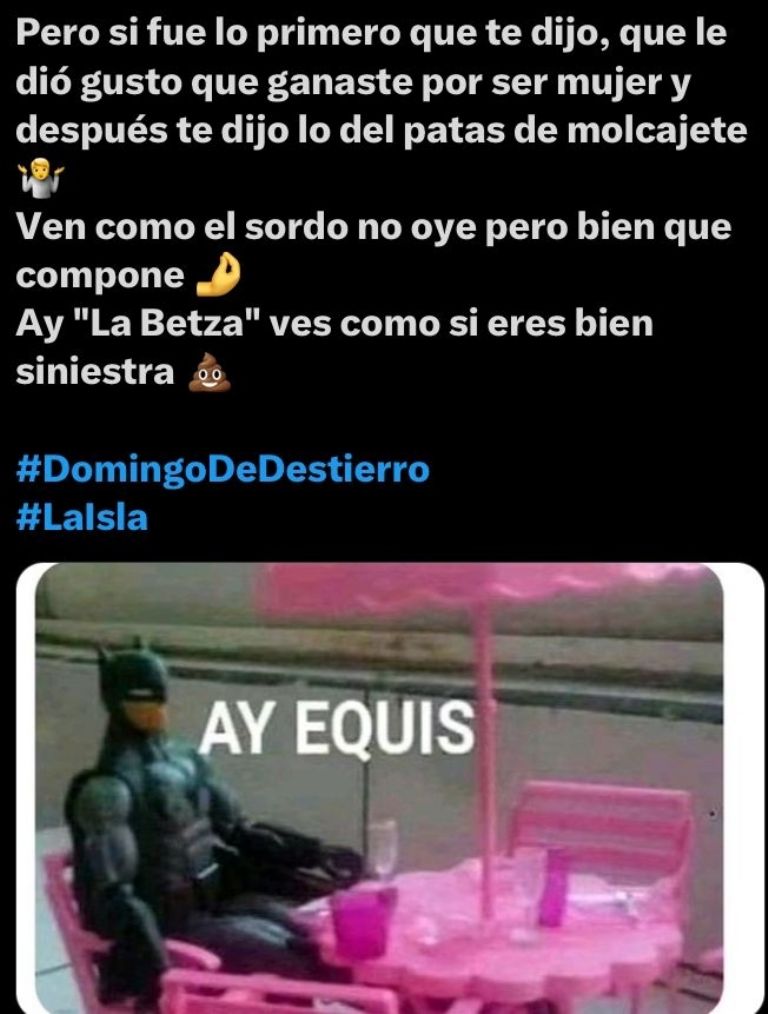 Antes de jugarse la Última Batalla en la Isla 2023, Alejandro Lukini puso en juego el brazalete para que uno de los participantes pasara a la final y fue Andrés; por lo que en el Juicio, las tres integrantes sentenciadas fueron, la campeona de box Jackie Nava, Julieta y Betsabé, siendo la pugilista quien terminó siendo la eliminada y los MEMES lamentan su fracaso.