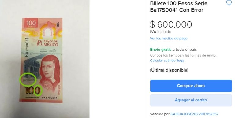 Por estas dos razones es que el dueño del billete de 100 pesos, que lo presentó en la plataforma especializada Mercado Libre, no pide menos de 600 mil pesos por él. Dicho esto, también se recomienda asistir con un experto en la numismática para que sea él quien brinde más detalles al respecto de la hipotética adquisición de este artículo.