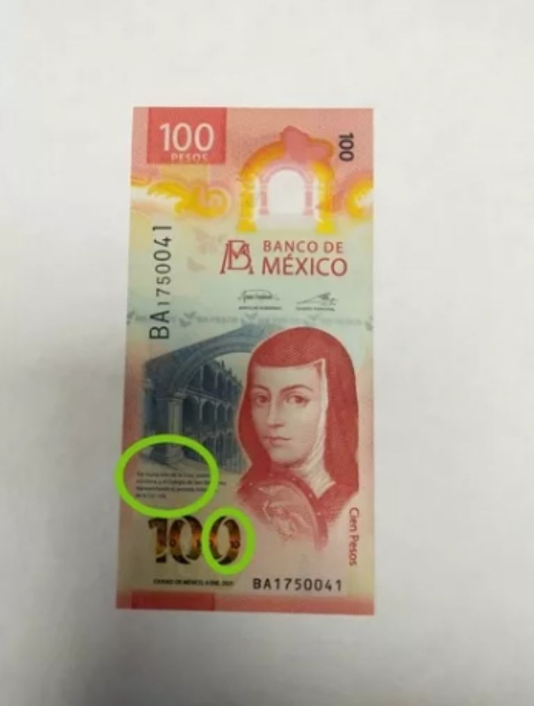 El billete de 100 pesos cuenta con dos errores de impresión. El primero aparece en el corte del billete mismo en donde una de las letras de la parte inferior izquierda no se vislumbra del todo bien, mientras que el segundo guarda relación con el número incompleto dentro del engomado del propio ejemplar, pues este es “10” en lugar de “100”.