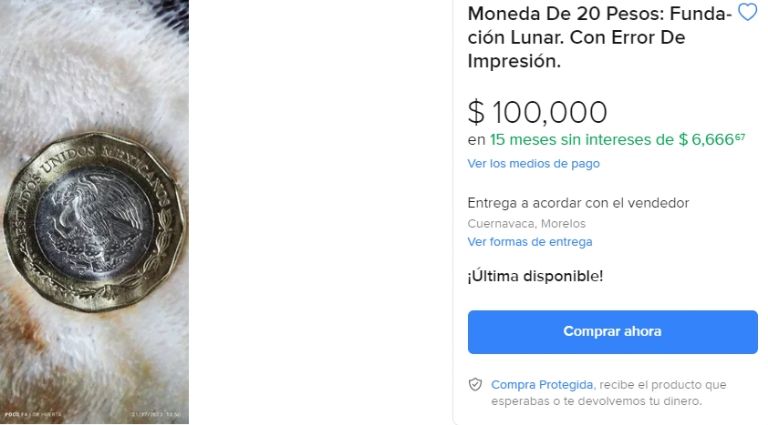 El propietario de esta moneda de 20 pesos la compartió en Mercado Libre, una de las plataformas especializadas en compra y venta de artículos relacionados a la numismática. Para ello, el dueño informa que vive en la ciudad de Cuernavaca y, para deseo de los coleccionistas, compartió un total de tres imágenes de dicho ejemplar.