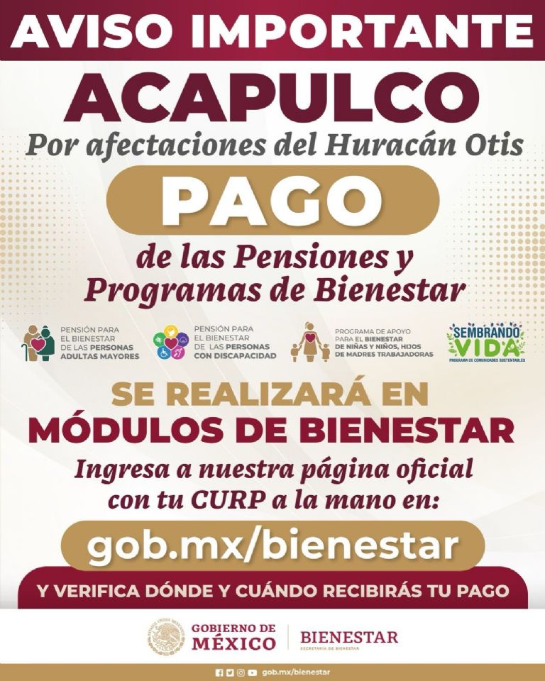 La Pensión Bienestar brinda el dinero suficiente para cubrir sus necesidades a las personas adultas mayores de 65 años, con discapacidad y niñas y niños, hijos de madres trabajadoras en todo el país para que ayude a mejorar las condiciones de vida y que a su vez permita el acceso a la protección social.
