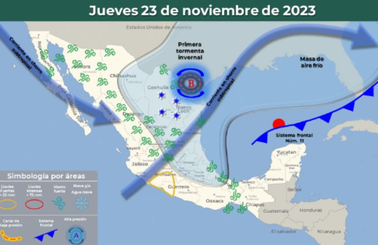 No obstante, y cuando la primera Tormenta Invernal se aleje se mantendrá el Frente Frío 11, mismo que seguirá afectando a la República Mexicana. El SMN establece que se extenderá con características de estacionario sobre el sur y el oriente de México gracias a su interacción con una baja presión, lo cual hará que las lluvias puntuales fuertes y las heladas estén garantizadas.