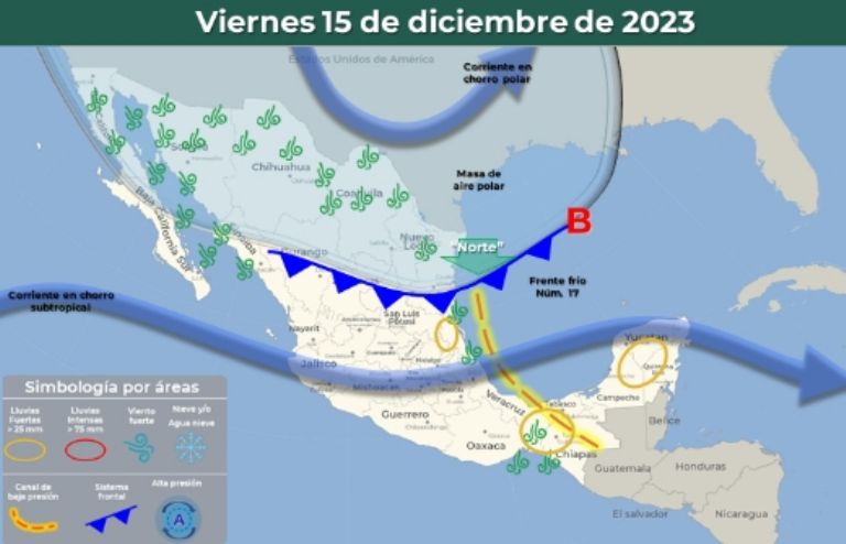 Según información detallada por el Gobierno de México a través del Servicio Meteorológico Nacional y la Conagua, los 14 estados que se mostrarán a continuación sufrirán las alteraciones del Frente Frío 17, a través de sus lluvias y heladas, durante hoy viernes 15 de diciembre del 2023. ¡Toma las precauciones necesarias y evita salir de casa!