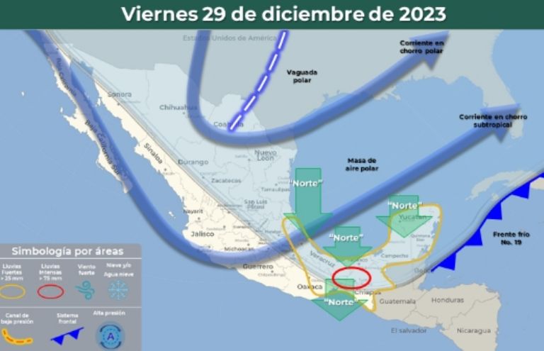 Finalmente, el Frente Frío 20 y su unión con la masa de aire polar cubrirán gran parte de la República Mexicana, motivo por el cual no solo las lluvias estarán presentes, sino que también un ambiente frío y muy frío con posibles heladas y mínimas de -10 grados se vislumbran en el norte, noroeste, noreste, oriente, centro y sureste del territorio nacional.
