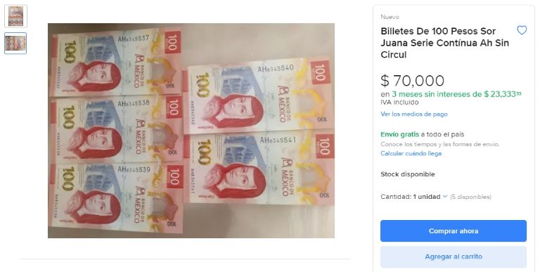 Mercado Libre representa la plataforma en que los especialistas y amantes de la numismática acuden para evaluar piezas de antaño del territorio nacional. ¿Es el caso de esta colección de billetes de 100 pesos? Te advertimos que no es así; sino que, como parte de sus características, corresponde a uno de los diseños más recientes.