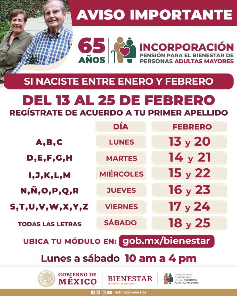 Si tú cumples años en enero y febrero y este 2023 llegas a los 65 años… ¡¿qué esperas?! Regístrate a la Pensión Bienestar para comenzar a recibir tus pagos en marzo, presentando acta de nacimiento, CURP, identificación vigente (INE, pasaporte, Inapam u otro documento que acrediten tu identidad, pero que hayan sido expedidos por la autoridad correspondiente) y comprobante de domicilio (máximo seis meses de antigüedad) o constancia de residencia de la autoridad local.