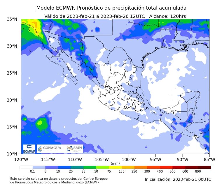 De tal modo, el jueves 23 de febrero se esperan lluvias puntuales fuertes en Baja California, aisladas en Sonora, Baja California Sur, Coahuila, Chiapas y Oaxaca y caída de nieve o aguanieve en Baja California, con temperaturas mínimas para la madrugada del viernes de -15 a -10 grados centígrados con heladas en zonas montañosas de Durango y Chihuahua, de -10 a -5 en zonas montañosas de Sonora y Baja California y de -5 a 0 en el Estado de México y Zacatecas.