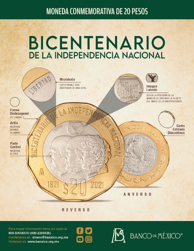 En el reverso tiene acuñada la leyenda “Bicentenario de la Independencia Nacional”, los bustos de perfil de Miguel Hidalgo, José María Morelos y Pavón y Vicente Guerrero, la palabra “Libertad” en el lado izquierdo, en el centro el Ángel de la Independencia como imagen latente, en el exergo la denominación “$20” con los años “1821” a la izquierda y “2021” a la derecha y la ceca de la Casa de Moneda de México “M°.