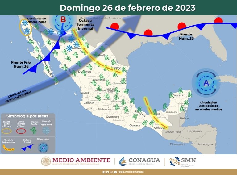 Junto con la octava tormenta invernal, el frente frío 36 ingresó a México y en interacción con las corrientes en chorro polar y subtropical ocasionan este domingo 26 de febrero remolinos de polvo o tolvaneras, ambiente frío a muy frío, lluvias y chubascos en el noroeste del país, así como tormentas fuertes en Baja California, caída de nieve en las sierras de Baja California y posible aguanieve en la sierra norte de Sonora.