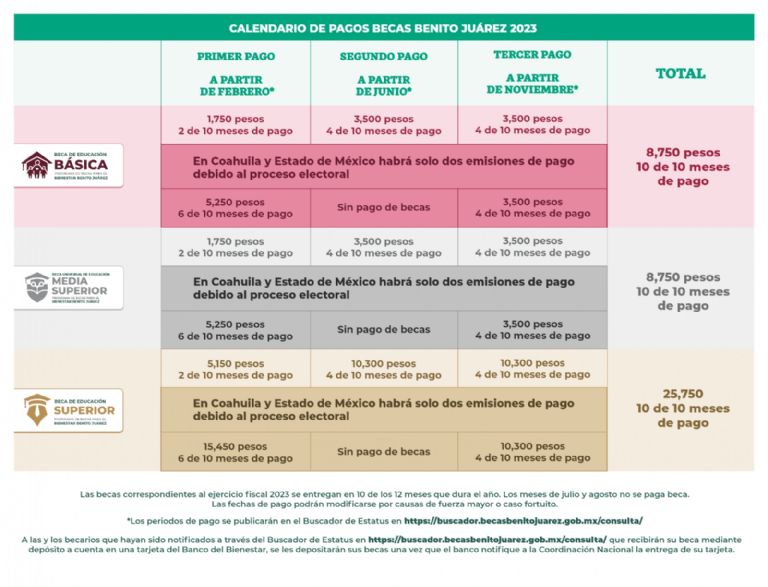 La Coordinación Nacional para el Bienestar dio a conocer el calendario oficial de los tres pagos de la Beca Benito Juárez a lo largo de todo 2023, con excepción de Coahuila y Estado de México, donde solo se realizarán dos depósitos por el proceso electoral de junio para elegir gobernador y para que no se confunda con un acto proselitista en favor de cualquier partido.