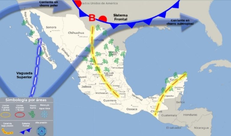 Todo iniciará gracias a los dos canales de baja presión que se extienden desde la Mesa del Norte hacia el sureste de la República Mexicana, esto aunado al ingreso de humedad que se genera por la corriente en chorro subtropical y aquel que ingresa directamente desde el Golfo de México, lo cual traerá consecuencias en cuanto al clima se refiere.