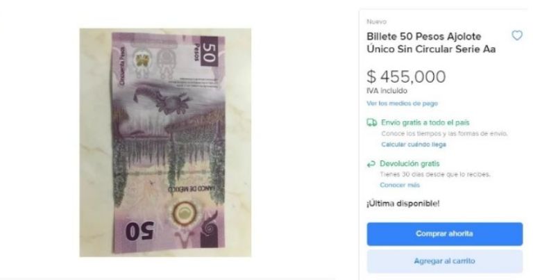 Es en esta misma página especializada que el propietario del billete le coloca un precio de 450 mil a la o las personas que se interesen por él. Y es que, además del ajolote, el mismo cuenta con las letras AA en su serie, motivo por el cual ha llamado poderosamente la atención no solo de los aficionados, sino de algunos expertos que se dedican a coleccionar estos.