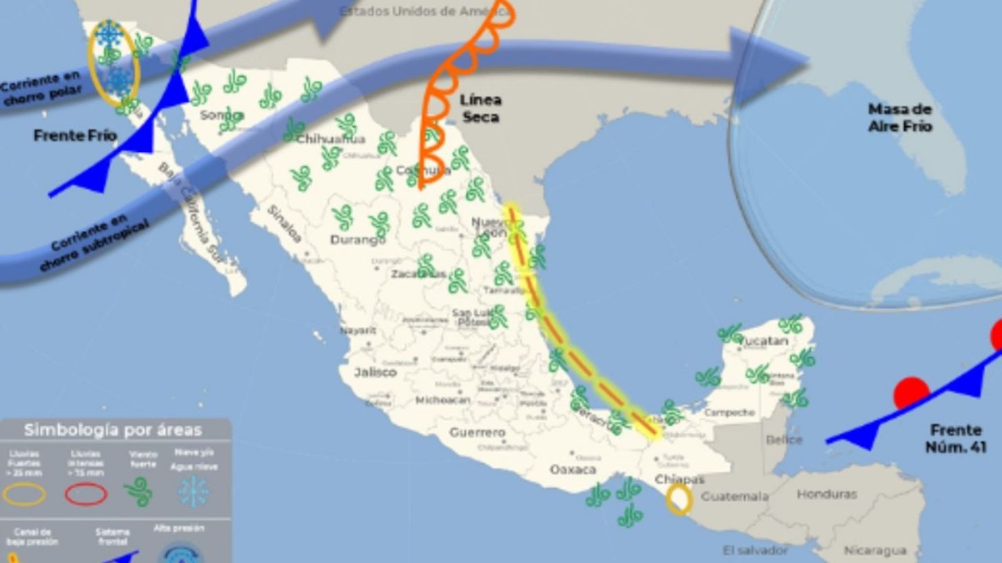 Finalmente, una línea seca establecida sobre el estado de Coahuila ocasionará fuertes rachas de viento con nuevas tolvaneras, mientras que el canal de baja presión en el sureste y occidente el Golfo y su ingreso de humedad desde el Mar Caribe generarán chubascos y lluvias en el oriente, noreste y sureste del territorio nacional, con lluvias más fuertes en el estado de Chiapas.