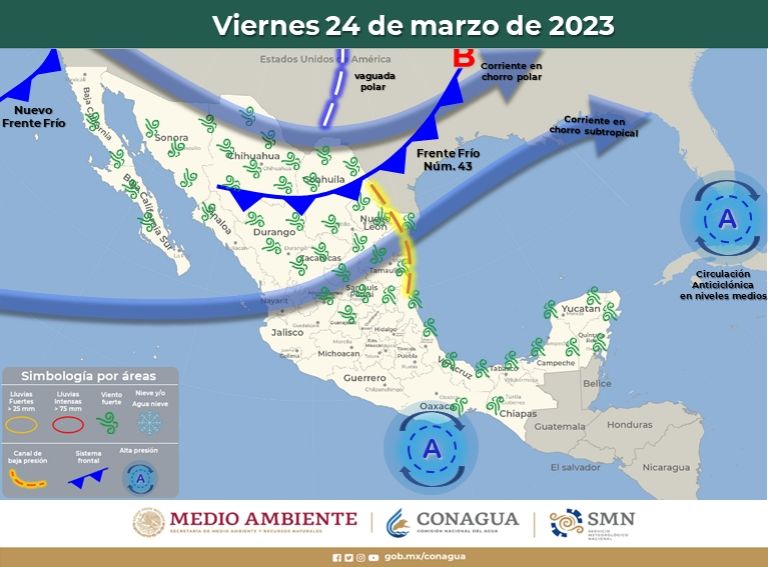 El Servicio Meteorológico Nacional informó que este viernes 24 de marzo el frente frío 43 se extenderá sobre el norte y noreste de la República Mexicana con vientos fuertes a muy fuertes, tolvaneras y nevadas sobre el norte y noreste del país; así como lluvias aisladas en Tamaulipas, aunque por la tarde el nuevo sistema frontal 44 ingresará al noroeste del territorio nacional con vientos fuertes y lluvias aisladas en Baja California. Checa cuáles serán los estados afectados.
