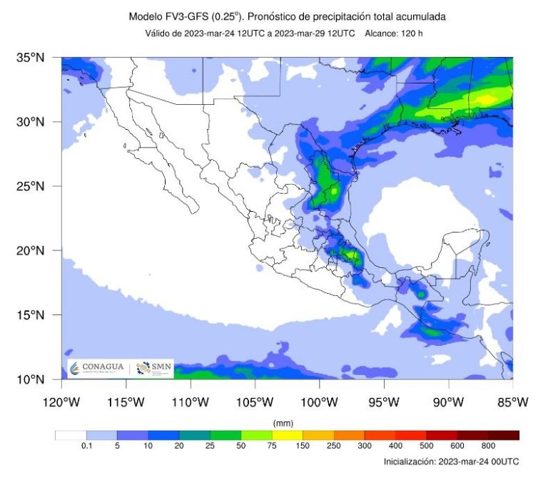El frente frío 43, en tanto, se extiende con características de estacionario sobre el norte y noreste de la República Mexicana, con posibles tolvaneras y vientos fuertes, lluvias aisladas con descargas eléctricas en Tamaulipas, San Luis Potosí y Nuevo León y chubascos y tormentas fuertes con descargas eléctricas y posibles granizadas y heladas debido a un canal de baja presión sobre estados del oriente, centro y sur del territorio nacional.