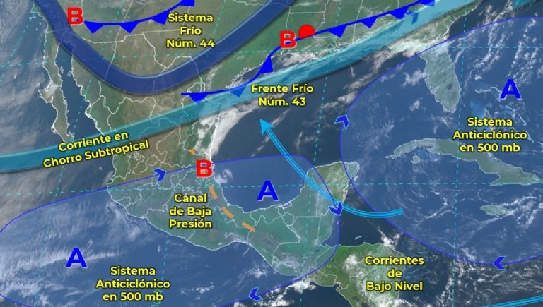Además del frente frío 43, un canal de baja presión se extenderá este 26 de marzo sobre estados del oriente, centro y sureste del país con lluvias y chubascos en las mencionadas regiones, además de granizadas en el Valle de México, Puebla, Hidalgo y Tlaxcala, así como torbellinos y vientos de entre 50 y 70 kilómetros por hora en Veracruz, Campeche, Oaxaca, Quintana Roo y Yucatán.