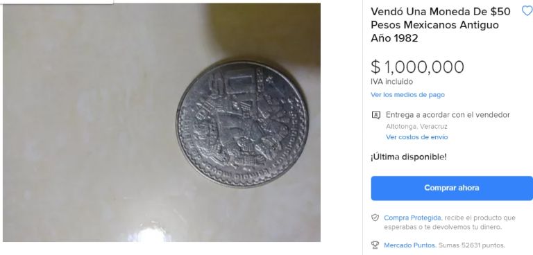 En la parte de atrás, al centro, se muestra el Escudo Nacional en relieve escultórico, con la leyenda “Estados Unidos Mexicanos” formando el semicírculo superior y aunque se trata de una de las monedas más bellas y peculiares emitidas por el Banco de México, su valor no alcanza los 200 mil que piden por ella en otras publicaciones y mucho menos el millón que este vendedor de Altotonga, Veracruz, espera por ella.