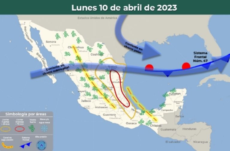 Los estragos del clima no cesan al interior de la República Mexicana. La onda de calor poco a poco comienza a apoderarse de la mayor parte del país; sin embargo, lo anterior no exime que las bajas temperaturas y las lluvias intensas se hagan presentes gracias a los canales de baja presión, hecho que sucederá durante este lunes 10 de abril.