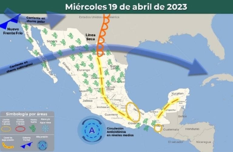 El Gobierno de México entrega un pronóstico de cara a las próximas 96 horas en torno a los pronósticos del tiempo. Bajo esta panorámica, en los siguientes párrafos conocerás cuáles serán los principales estados afectados por las lluvias y las heladas del nuevo Frente Frío durante hoy miércoles 19 de abril. ¡Toma tus precauciones!
