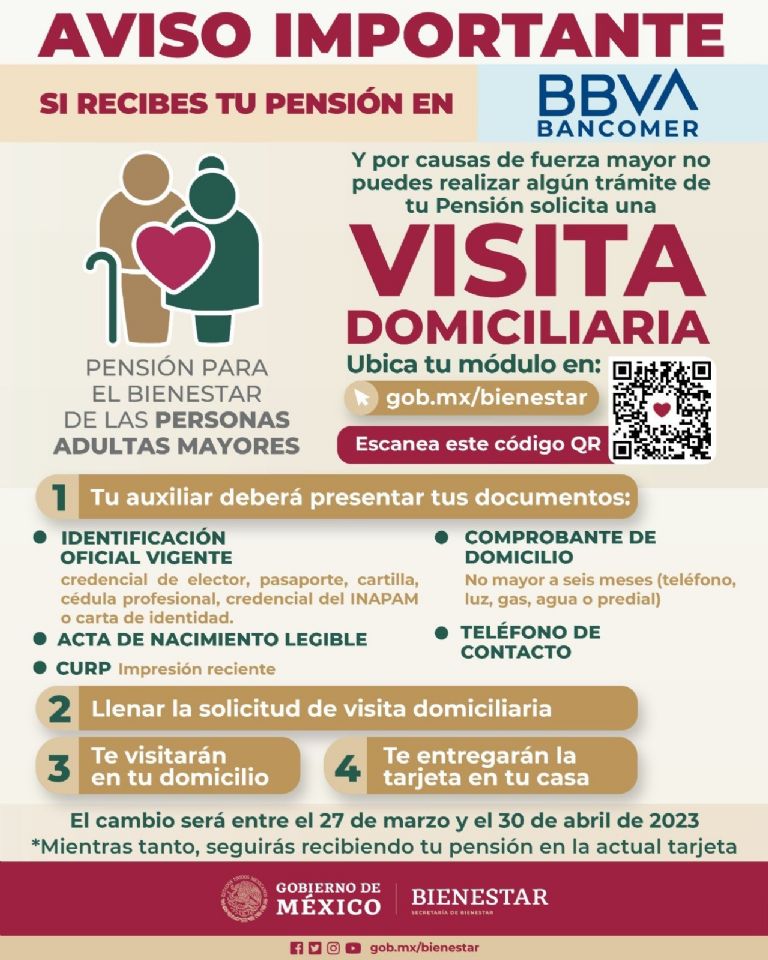 Como ya pasó con la tarjeta Banamex, ahora miles de adultos mayores afiliados deberán hacer el cambio de la tarjeta Bancomer a la nueva de la Pensión Bienestar hasta esta fecha límite, como parte de la bancarización para que dejen de pagar comisiones a instituciones bancarias privadas y lo reciban sus recursos de manera íntegra por medio del Banco del Bienestar.
