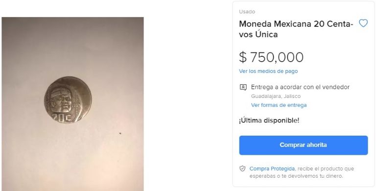 Las monedas mexicanas antiguas son muy cotizadas en el mercado; no obstante, aquellas que tienen errores clave en su composición superan las barreras de los miles de pesos en Internet. Ese es el caso de esta moneda de 20 centavos que está siendo vendida en 750 mil pesos a través de una plataforma de compra y venta en la web. ¿La adquirirías?