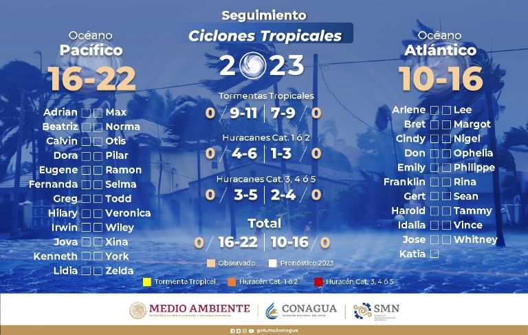 Según el Servicio Meteorológico Nacional (SMN), se esperan de 16 a 22 ciclones tropicales esta temporada de huracanes 2023 en el Océano Pacífico que incluso ya tienen nombres, aunque en caso de que haya más la Organización Meteorológica Mundial (OMM) tiene otra lista alternativa para denominarlos.