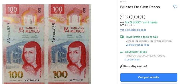 El dueño de estos 2 billetes de 100 pesos, mismo del que se desconoce el estado en donde habita, compartió un par de imágenes al derecho y al revés de cada uno de estos. En adición a ello, dejó claro que cualquier persona interesada en estos artículos tiene la opción de obtenerlo con un pago general o, bien a través de 12 meses con pagos mensuales de 1,666 pesos.