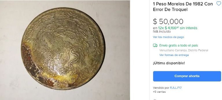 Como ocurre con la mayoría de los ejemplares relacionados a la numismática, esta moneda de 1 peso se puede encontrar en Mercado Libre, plataforma especializada en artículos de compra y venta. El dueño de este ejemplar entiende que desembolsar 50,000 pesos de contado no es sencillo, motivo por el cual le brinda a los coleccionistas la posibilidad de realizar 12 pagos mensuales de 4,166 pesos.