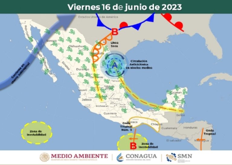 Lo primero que debemos mencionar es que el Servicio Meteorológico Nacional tiene previsto que entre las 08:00 horas de este viernes 16 de junio y las 08:00 horas del sábado 17 de junio, seguirá una circulación anticiclónica en niveles medios de la atmósfera, lo que provocará que la Onda Tropical 3 siga en el territorio nacional,