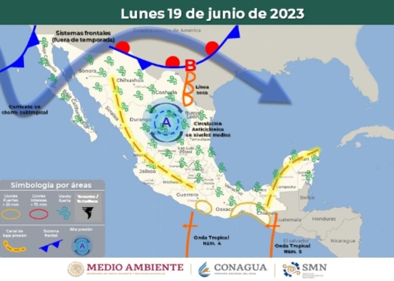 La tercera Ola de Calor ha penetrado profundo en varios estados de la República Mexicana en, al menos, las últimas dos semanas. Sin embargo, lo anterior no exime que el país viva periodos de lluvias derivadas de las Ondas Tropicales y del Frente Frío fuera de temporada, motivo por el cual conocerás los lugares con este pronóstico durante hoy lunes 19 de junio.