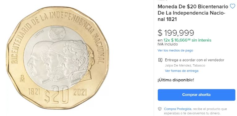 El propietario de esta moneda de 20 pesos la vende en Mercado Libre, la plataforma por excelencia en cuanto a ventas relacionadas con la numismática. El mismo reside en el estado de Tabasco y, para comodidad de sus clientes, pone a disposición un método de pago que consiste en 12 mensualidades de 16 mil 666 pesos cada una.
