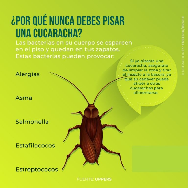 La Organización Mundial de la Salud (OMS) llama a no pisar cucarachas, que proliferan principalmente en temporada de calor y que pueden entrar a tu hogar ya sea por las coladeras, grietas o tuberías, pues eso podría tener graves consecuencias al ser portadoras de enfermedades intestinales como estafilococos, tifoidea o disentería.