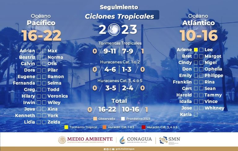 El Servicio Meteorológico Nacional (SMN) dio a conocer que con la llegada de Arlene se esperan lluvias fuertes a muy fuertes en Coahuila, Tamaulipas, Chiapas y Nuevo León; fuertes en Puebla, Oaxaca y Veracruz; chubascos en San Luis Potosí, Hidalgo, Querétaro, Estado de México, Tlaxcala, Guerrero, Morelos y Ciudad de México, así como tormentas aisladas en Guanajuato, Zacatecas, Michoacán, Yucatán, Campeche y Quintana Roo.